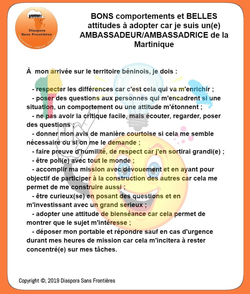 Diaspora Sans Frontières a proposé ce vade-mecum aux jeunes pour qu’ils puissent avoir un comportement d’ambassadeur digne de la Martinique et aussi respecter le pays qui les accueille.